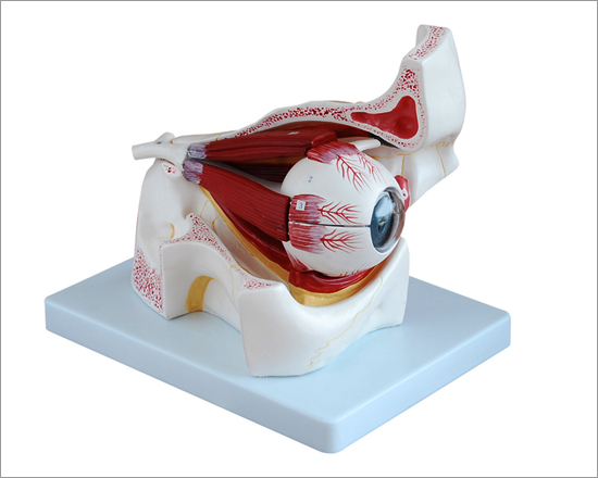 The model shows the eyeball with optic nerves and muscles in its natural position in the bony orbit. Dissectible into 10 parts, 3 times enlarged.