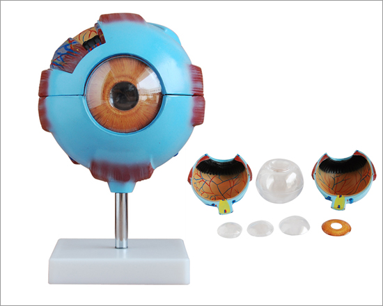 The different parts of the eyeball model are detachable to show the following structures. 1. Tunica external: showing cornea and sclera with attachments of ocular muscles and optic nerve. 2. Tunica media: showing the iris, the ciliary body and the chorioid. 3. Tunica internal is retina. 4. Refraction media: showing the lens and the vitreous body. 6 times enlarged. On stand.