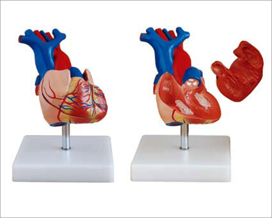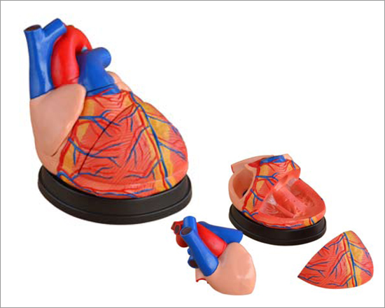 This model shows the anatomy of human heart with aortic arch, coronal section of atrium and ventricle, valves, and veins in great anatomical detail. Dissectible into 3 parts. 4 times enlarged