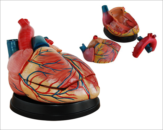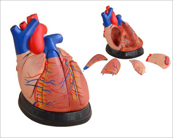 This model shows external features and internal structures of heart and its relation between large blood vessels. Dissectible into 5 parts, 3 times enlarged.