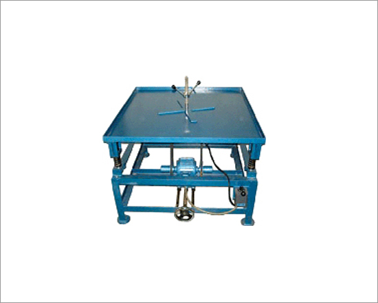 Specifications: It is designed to carry a load of 140Kg. The apparatus consists of a motor fitted with a variable pitch pulley housed in a cabinet. The vibrations are imparted by means of off-balance masses rotating on a shaft of a vibrator clamped to the underside of the table top. The table top is 50cm x 50cm. and has stops along its edges to prevent moulds from walking off the table during vibration. A cross arm adjustable on a vertical rod at the center of the table is provided to hold the moulds while operating the table. The variable pitch pulley arrangement permits the frequency to be varied sleeplessly between a maximum of 3600 vibrations down to 2600 vibrations per minute. A speed regulation handle is provided for increasing or decreasing the frequency. A switch is provided for starting the motor suitable for operation on 1440 volts, 3 phase, 50 cycles, A.C. supply.