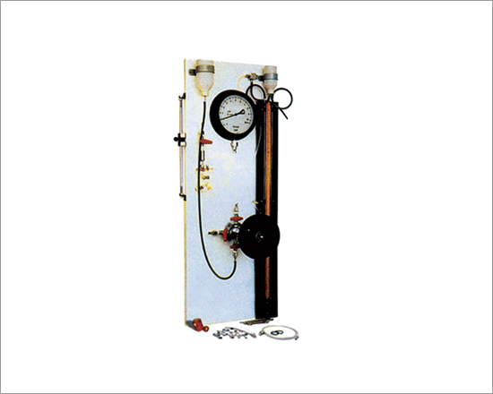 When conducting triaxial tests on soil samples, it is observed that due to internal pressure, the cell expands, soil specimen consolidates resulting in the change of volume change Gauge is therefore devised to accurately measure volume changes. This is measured by observing the quantity of water entering or leaving the cell as the cell pressure and axial load are changed it is achieved by the displacement of free surface between the water supplied to the cell and another fluid (Paraffin of kerosene). A dye is added to the paraffin for clear demarcation of the interface. The unit consist of a glass graduated tube of the appropriate capacity graduated to parts of a ml. enclosed in a perpex tube sealed by two end caps. The unit is fitted with manifolds and valves which enable it to be sued with the triaxial cell and the constant pressure (Mercury controls) system. The cell pressure can either be directly applied to the cell from the constant pressure system or through the volume change gauge. The graduated glass tube is not subjected to any difference in pressure and its inside is coated with a layer of silicon water repellent to reduce the error in meniscus. There is an arrangement for filling the unit with water and paraffin and a drainage valve is provided in the lower end cap. The whole assembly is mounted on a panel suitable for wall mounting. The unit is supplied complete with a pressure hose with end couplings and a packet of dye.
