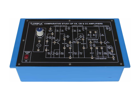 Experimental Training Board has been designed specifically for the Comparative study of Common Emitter (CE), Common Base (CB) and Common Collector (CC) Transistor Amplifiers. These practical transistor amplifier configurations are evaluated in respect of their main parameters and results are compared with theoretical calculations.