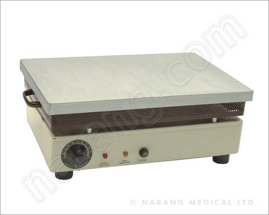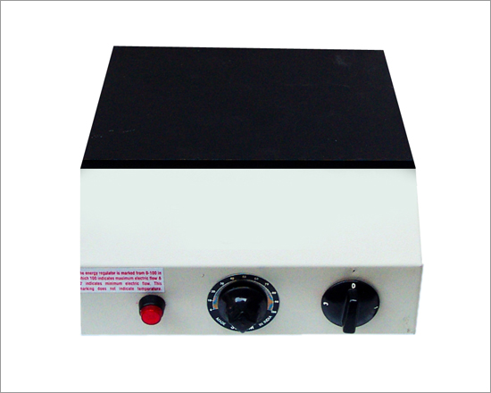 It has temperature range upto 350 degree celsius. Suitable for general purpose laboratory heating. It has a rectangular cast iron plate fixed on a thick mild steel body. Heating elements made of high temperature kanthal wire are fixed beneath the plate. Body is covered with thick layer of epoxy polyster paint to provide a highly screech & heat resistant surface for long lasting attractive finish. Temperature is controlled by an energy regulator with continuous type heat control.