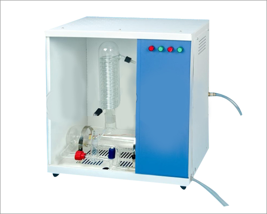 The apparatus consists of a boiler made from high purity quartz with built in heater and bottom discharge joint for easy cleaning of deposits. A spiral condenser is fitted on the boiler with receiving adapter. The unit comes with safety control unit (Optional) to protect the glass parts parts in case of water failure or overheating.