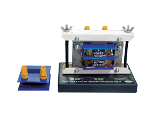 With one mains coil 230 to 240 V, 50 Hz, 2400 turns and two interchangeable secondary coils, 65 and 130 turns giving outputs of 6 and 12 V approximately at 2 A maximum. The laminated iron core is in two sections, 'T' and 'U' with butt joints, the stem of the 'T' having a cross section 24 x 24 mm. A simple channel and wing-nut clamping arrangement facilitates quick assembly and interchange of coils. The coils are wound on insulating bobbin, with 2-pin connection for mains and 4 mm sockets for the secondary outputs. The number of turns, voltage and amperage is marked on each coil. The transformer is supplied complete with 2 m of flex and a 2-pin mains connector. Overall dimensions 150x100x130 mm.