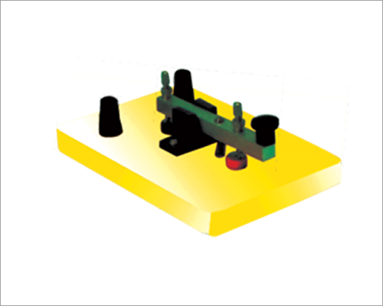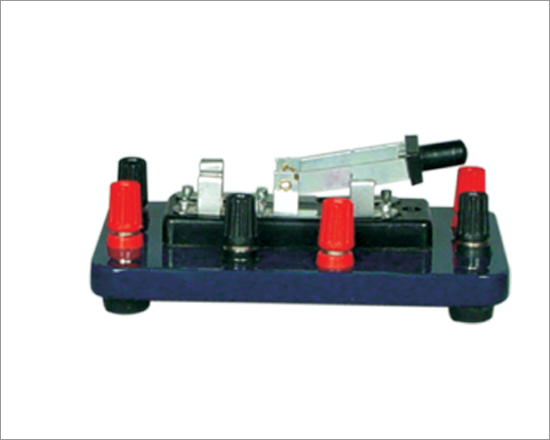 On rectangular wooden base with two terminals, pivoted contact arm with adjustable spring.