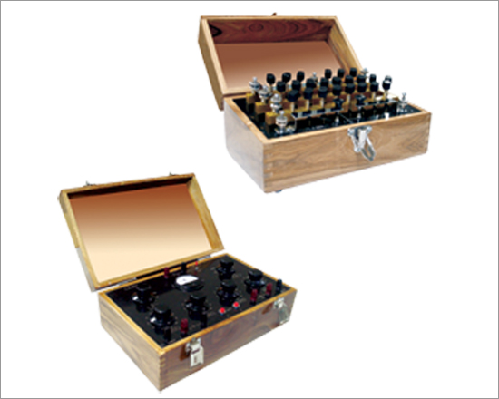 Plug type, in polished wooden box with hinged lid and panel to show circuit connections. Coils of constantan wire double silk covered are wound non-inductively. Three pairs of ratio arms are each 10, 100, 1000 ohms and resistance arms contains 16 coils from 1 to 5000 ohms with infinity plug. Total value 11, 110 ohms. Two spring keys having contact for battery and galvanometer fitted. Accuracy of coils 100 to 500 ohms + 0.05% and of the rest coils + 0.1%.