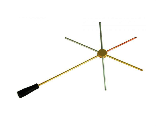 For demonstration of differences in the thermal conductivity of five different metal – brass, copper, aluminium, mild steel and stainless steel. These 5 metal rods spread radially outward, equally spaced on each side of hexagonal brass hub, and have a small recess at the other end for holding paraffin wax. The sixth side of brass hub has a metal rod terminating in an insulating handle. On heating the central hub, the wax contained in the cavities of different metals melts at different times, implying their different thermal conductivities.