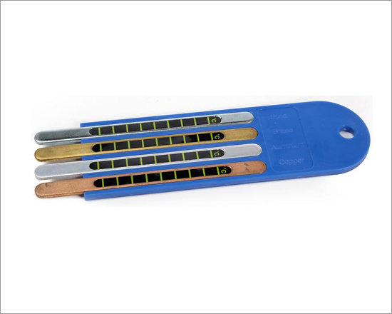 Ideal for comparison of thermal conductivity of different metals quickly and conveniently. Unique, new conductivity bar set features convenient liquid crystal indicators mounted in robust holders. Comprises four identical metal bars of same shape and size, each of different metal – copper, aluminium, brass and steel, held firmly parallel to one another in a rigid moulded carrier with a hole for convenient suspension. Conductivity value of each bar is clearly marked on the back of the support. The sensitive liquid crystal temperature indicators working in low temperature range, are attached to the front of all the four metal bars. The temperature indicators are marked at 1cm interval to facilitate charting the movement of temperature gradients. The rate of heat flow is indicated by timing the colour change across these markers. The demonstration requires only a beaker or container of hot water, thus doing away with open flames, hotplates, or messy "melting wax" method of comparison. Within seconds of placing the ends of the bars in hot water, a visible "heat pulse" travels to the copper bar; the steel bar takes several minutes to conduct the heat to its upper end. Timing the "heat pulses" enables estimation of the relative conductivities and their comparison with the stated theoretical values. Also demonstrates the conduction of heat from a heated bar to its end, if cooled.