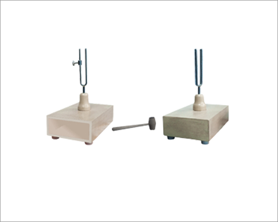 For demonstrating the production of beat frequencies. Comprises two nickel plated forks A (426.6) mounted on individual boxes. One fork is provided with adjustable mass by means of which frequency may be shifted from the nominal 426.6 When both forks are sounded a clearly audible 'beat' is produced, its rate depending upon the difference in frequency between the forks.