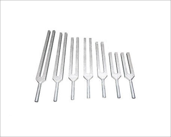 Each tuning fork is individually stamped with the musical scale note and the frequency in Hz at the base of each fork.
